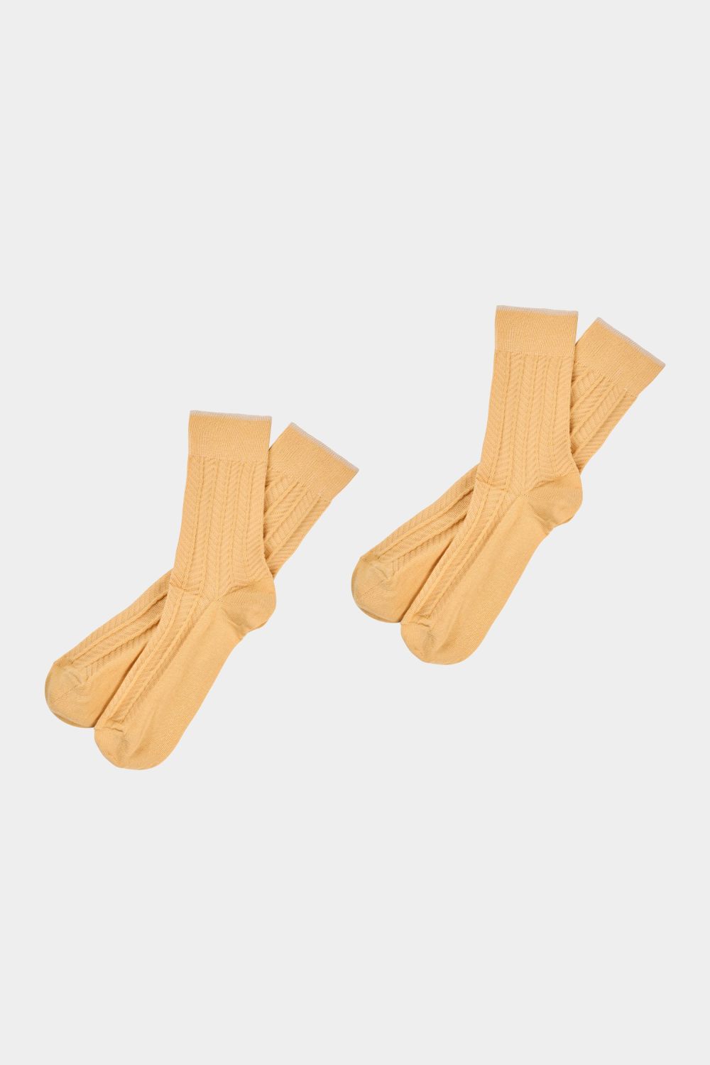 Et par strømper lavet af økologisk bomuldsgarn mikset med elastan for at sikre holdbarhed og god pasform. De er strikket i en klassisk ribstruktur med kontrastfarvet hæl og striber foroven. Strømperne har forstærkning ved tå og hæl samt en fast dobbeltkant foroven for ekstra komfort.