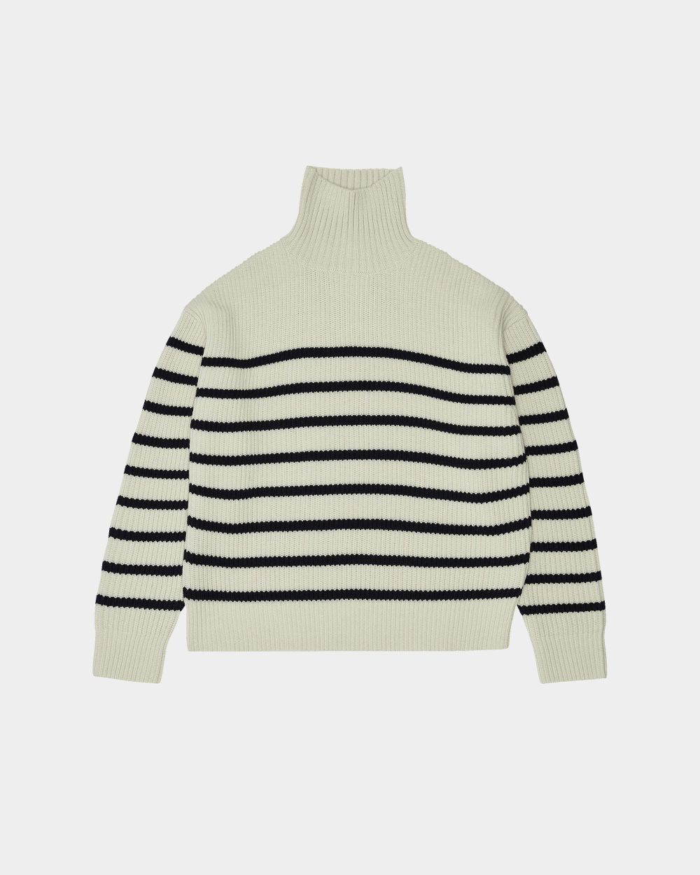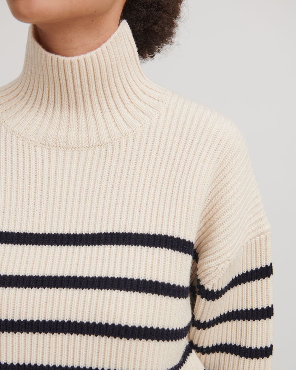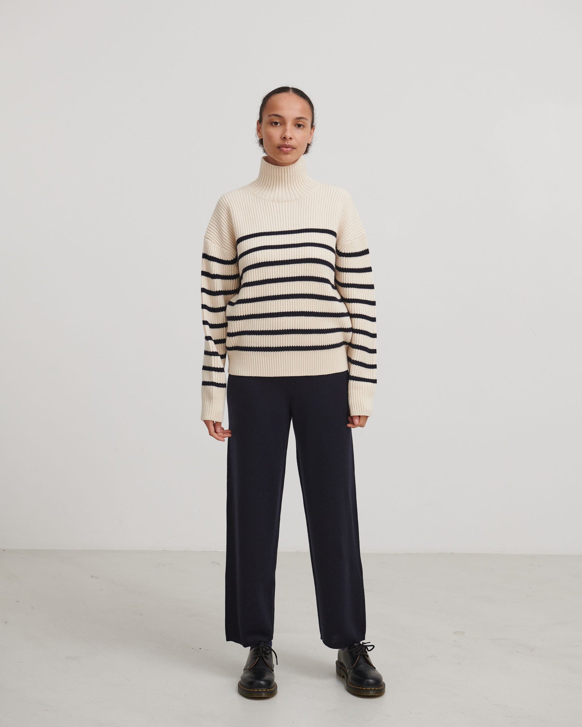 Made from pure merino wool this sweater has a high chimney neck and dropped shoulder. This sweater is knitted in a classic fisherman rib. It is made from pure merino wool and is available in a striped version and a solid colour version. The wool comes from non-mulesed sheep and is free from harmful chemicals.
