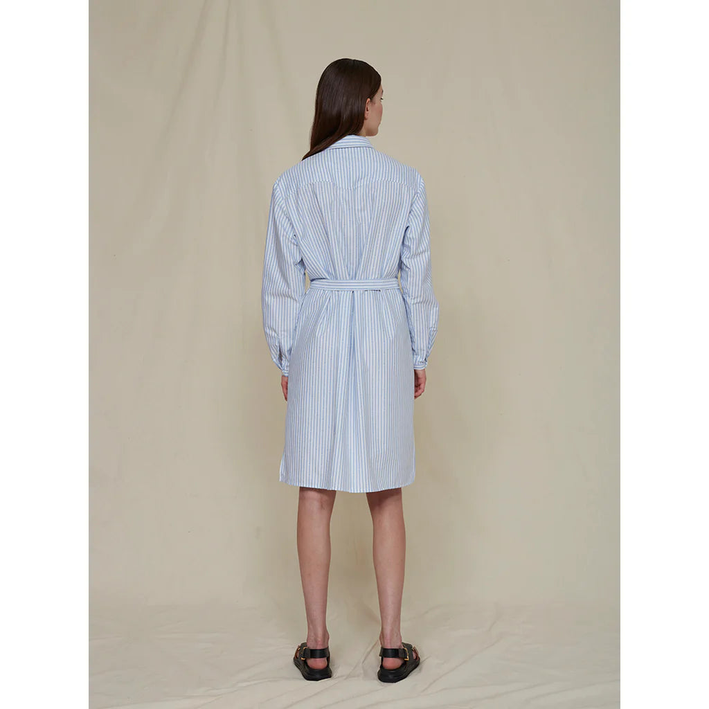 Helle Lau is the designer behind the Dilby Shirtdress with a tie belt, blending minimalistic, masculine silhouettes with feminine details for a unique and inspiring look. This shirtdress is crafted from 100% GOTS-certified organic cotton, featuring a striped weave and subtle detailing.