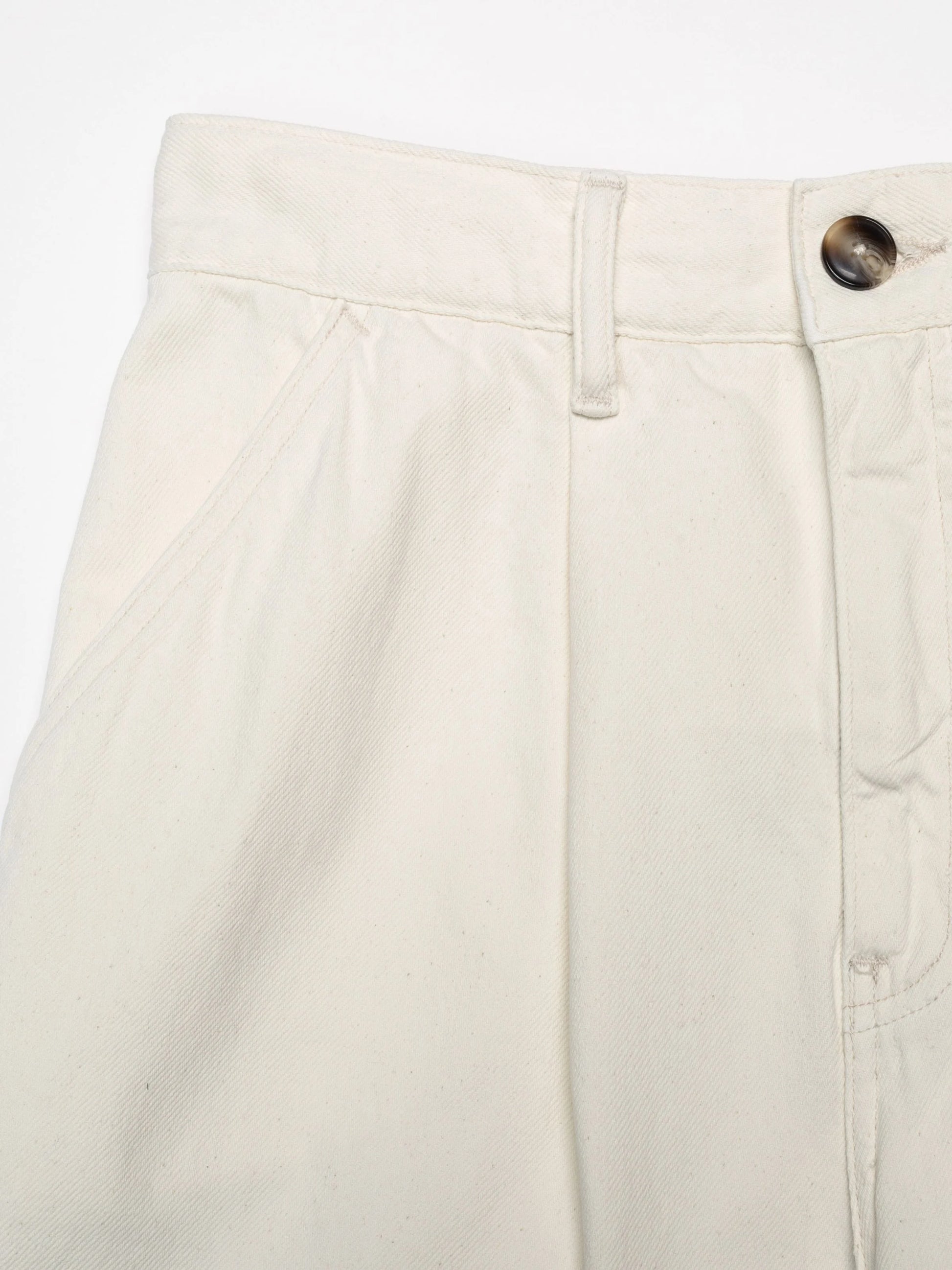 Gullan, our pleated loose-fit pants designed with a mid waist and wide leg crafted from the perfect off-white "Ivory" hue. Despite their simplicity, these pants hold an unexpected depth of character. Crafted from undyed organic cotton, the denim is ring-spun into irregular yarns with varying slubs, revealing subtle imperfections and a delicate marble texture that set them apart. The slightly contrasting thread adds an elegant touch. These white denim pants are simplicity perfected—minimalist yet rich in denim character.