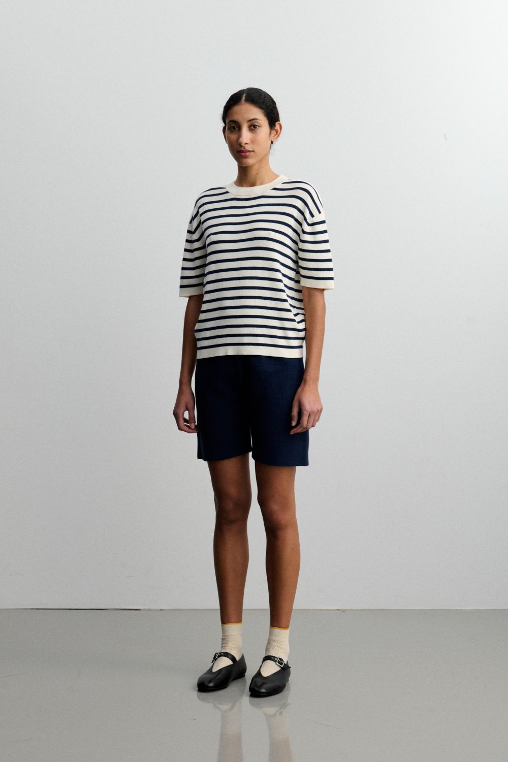 Disse shorts i økologisk bomuld er strikket i en fast vaffelstruktur med et panel af fast Milanostrik ved sømkanten. Shortsene har elastikkant i taljen, som sikrer en komfortabel pasform. De har en afslappet pasform med lavt skridt og brede, lige ben og er lavet af økologisk bomuld.