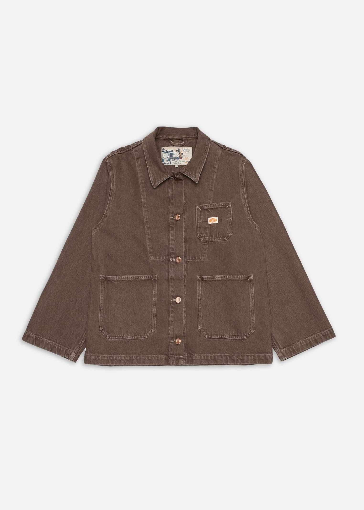 Denne jakke er fremstillet af Nudie Jeans' "Duck Canvas", et lysegrønt 2-lags kanvas lærredsmateriale, og er detaljeret med tonale syninger, en lynlås i rustfrit stål og kobberknapper. Den har påsyede lommer med dobbelt funktionalitet: hver lomme har en topflap til traditionel brug samt en lodret åbning i siden, der giver separate rum til både småting og et sted at varme hænderne.
