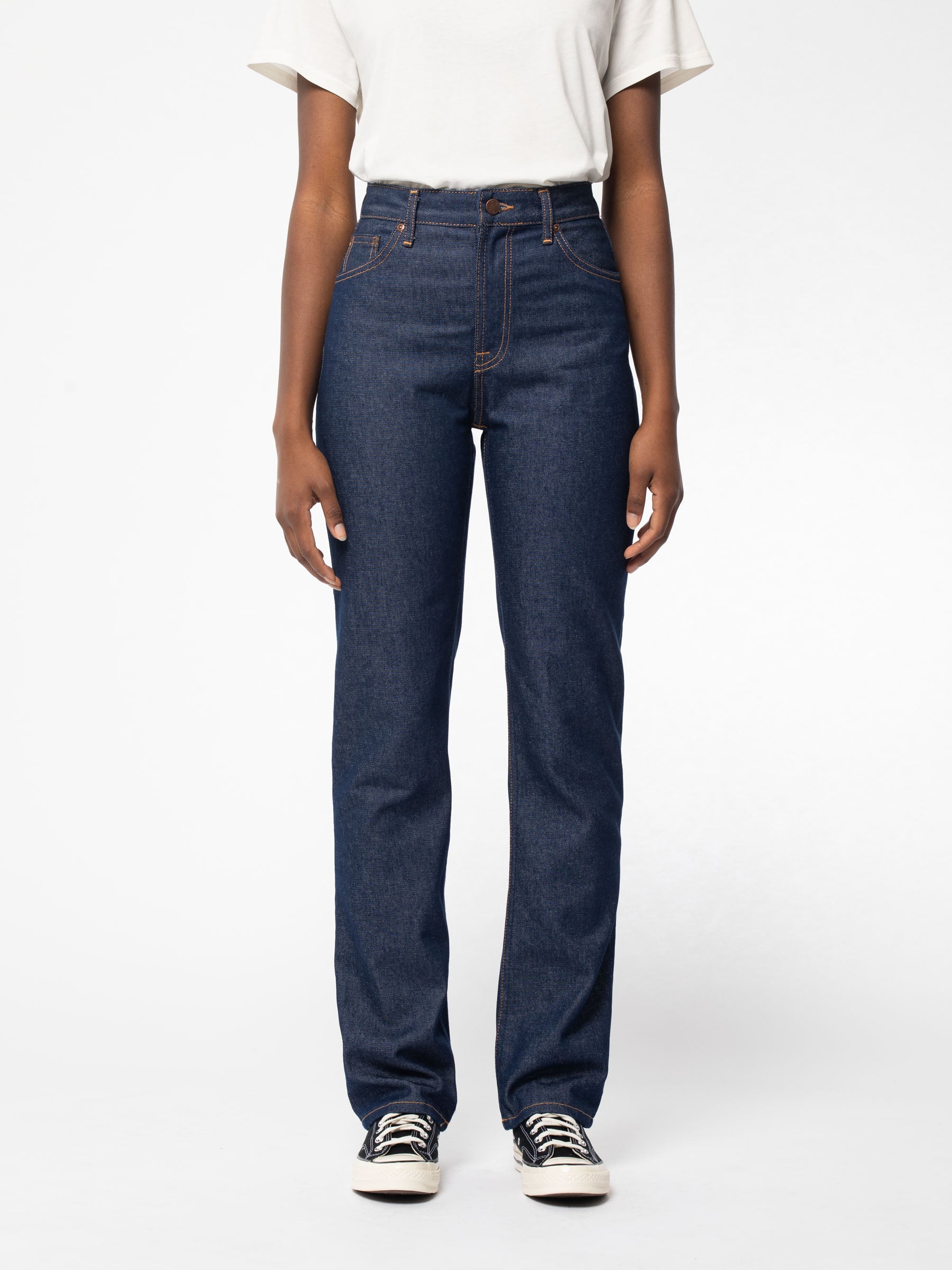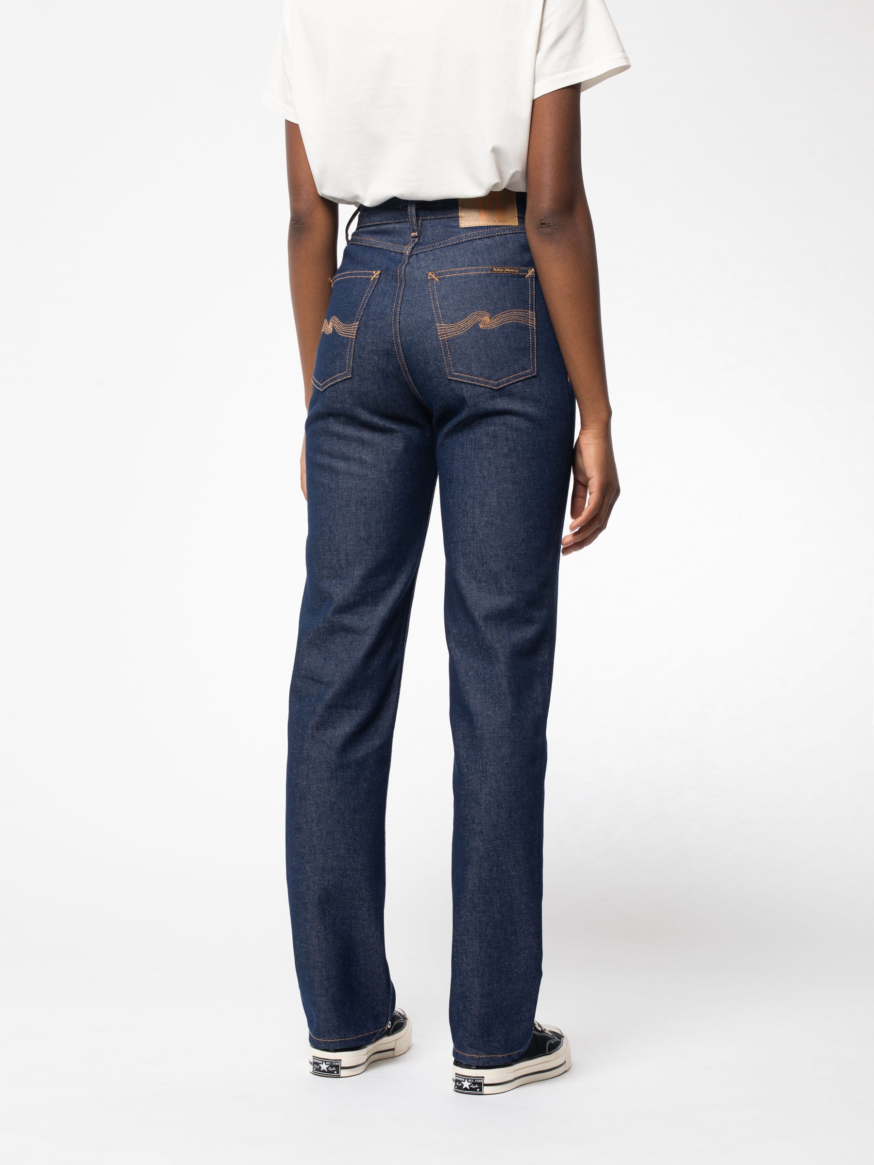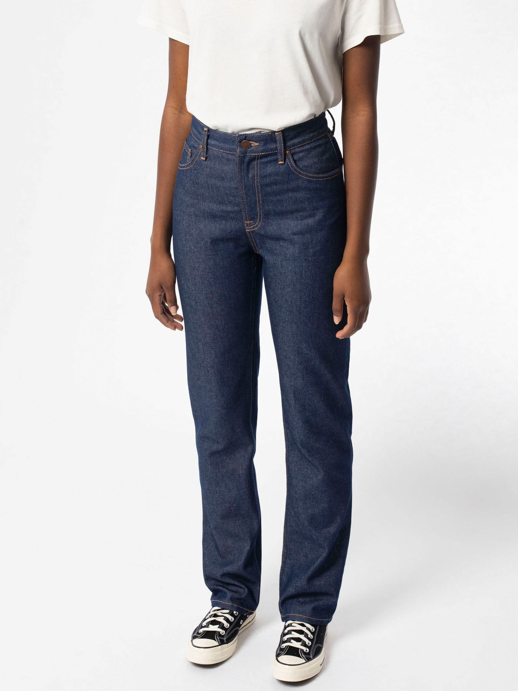 Lofty Lo fra Nudie Jeans er et par high waist relaxed fit jeans med lige ben i let mørkeblå denim. Fremstillet af denim bestående af 80% økologisk bomuld og 20% genbrugsbomuld.