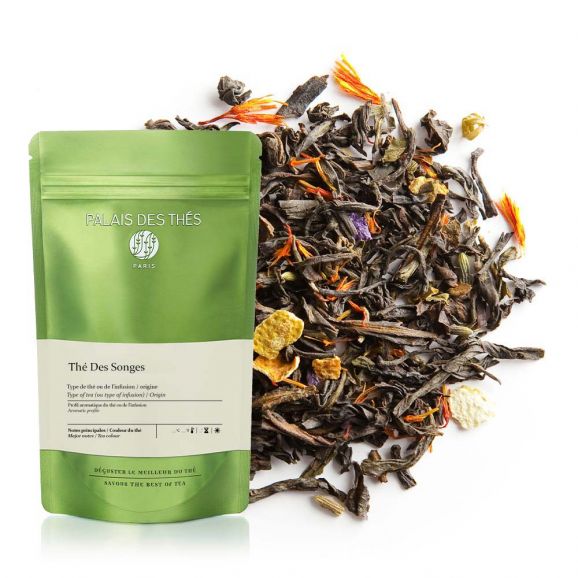 Thé des Songes er en lækker Oolong (halvoxideret te), smagt til med blomster og eksotiske frugter. Den er pyntet med blomsterblade samt citronskal.