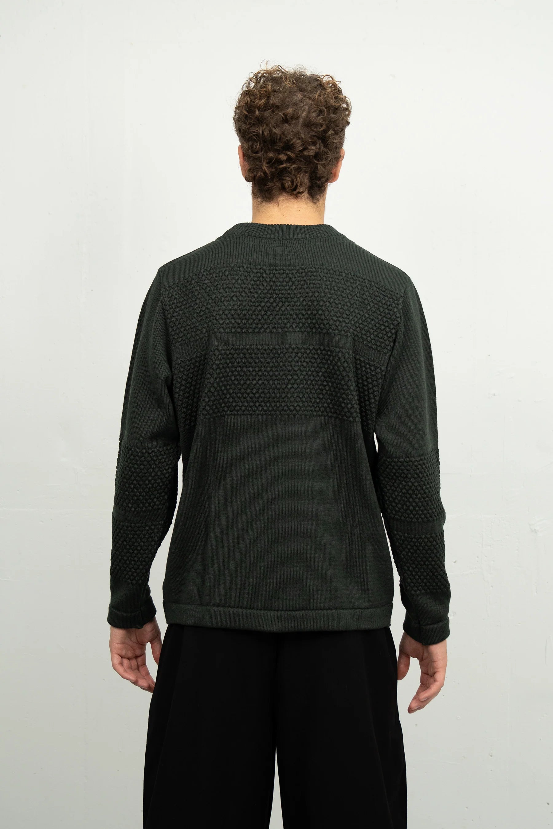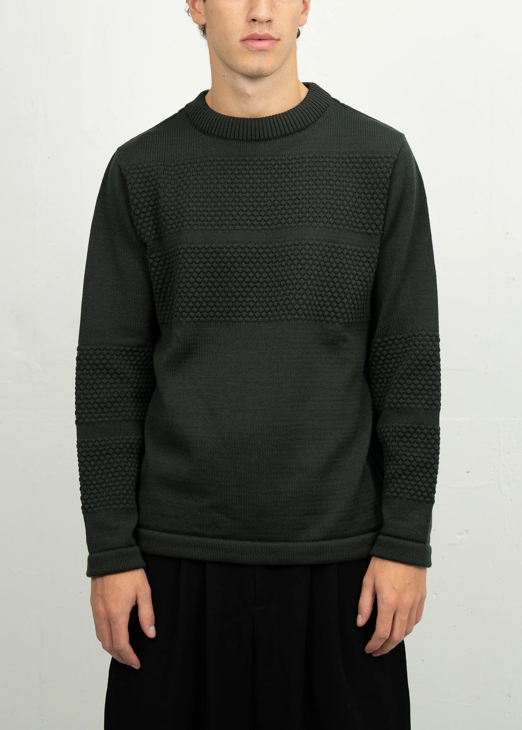 Rank-III Crew Neck-trøjen i sort er fremstillet af 100% ny merinould i en mellemvægtig 5-gauge strik. Inspireret af traditionelle fiskertrøjer har dette stykke et tekstureret yderlag og sømløse overgange mellem strikmønstre, hvilket giver både stil og komfort. Den fine merinould sikrer åndbarhed og varme, hvilket gør den ideel til lag-på-lag eller alene.