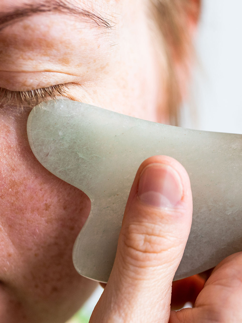 Gua sha-boksen består af én ansigtsrulle samt én gua sha. Sættet er udarbejdet i det utroligt slidstærke, krystalliserede mineraljadesten. Ved brug af øget blodgennemstrømning samt cellegenvæksten i ansigtets hud, som er afgørende for hudens kollagenproduktion og dermed hudens elasticitet. Virkningen er videnskabeligt bevist og mikrogennemstrømningen af blod øges med op til 4 gange i løbet af 8 minutters brug. Brugen af gua sha samt faceroller stimulerer ansigtets muskler og har dermed gode egenskaber til lindre af muskelsmerter- og spændinger.