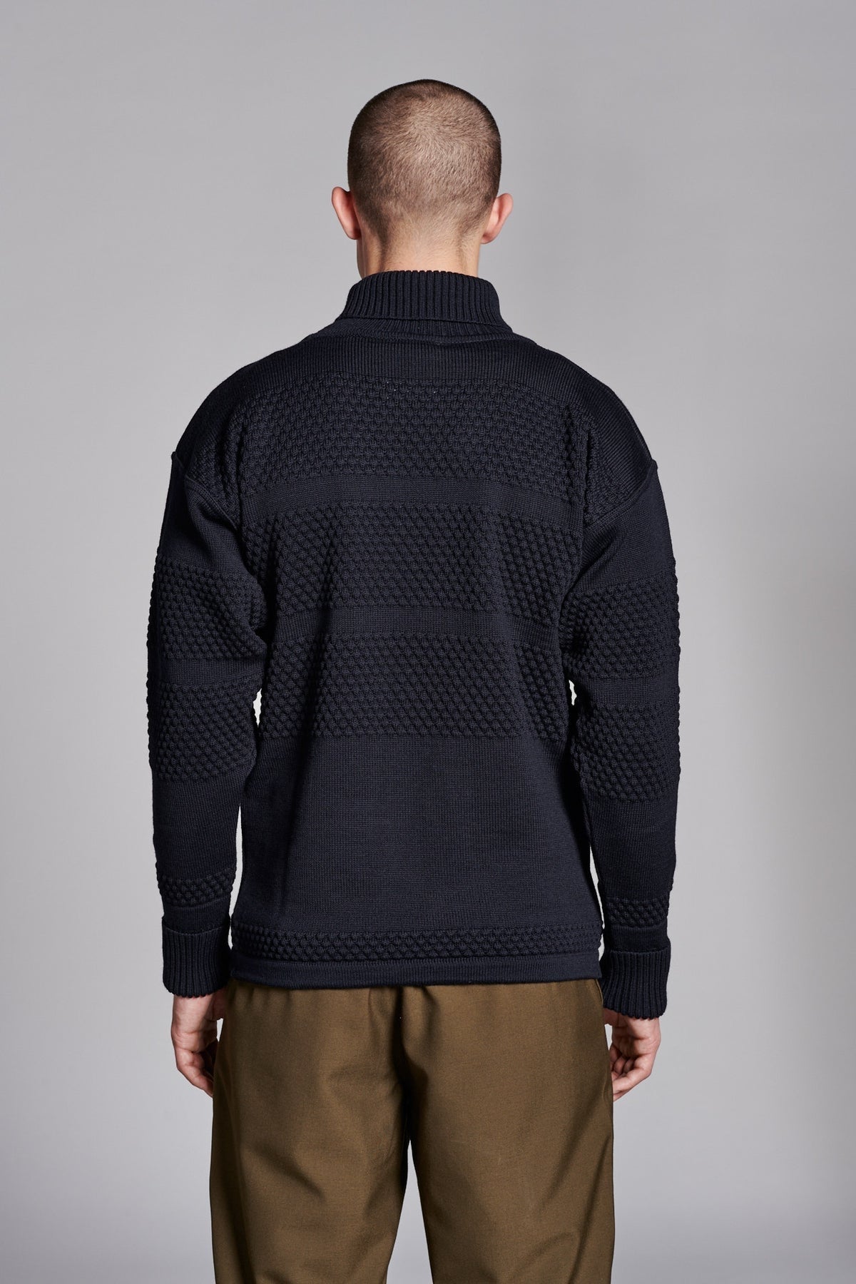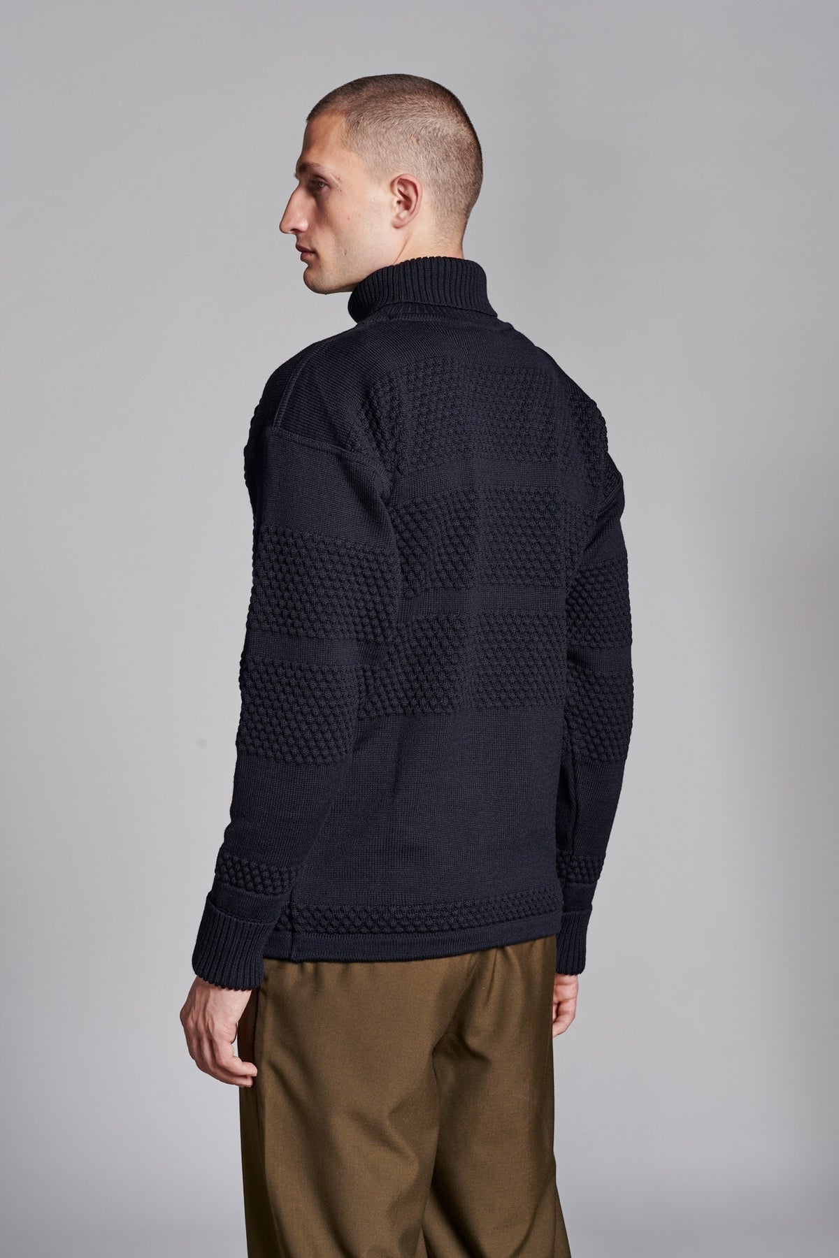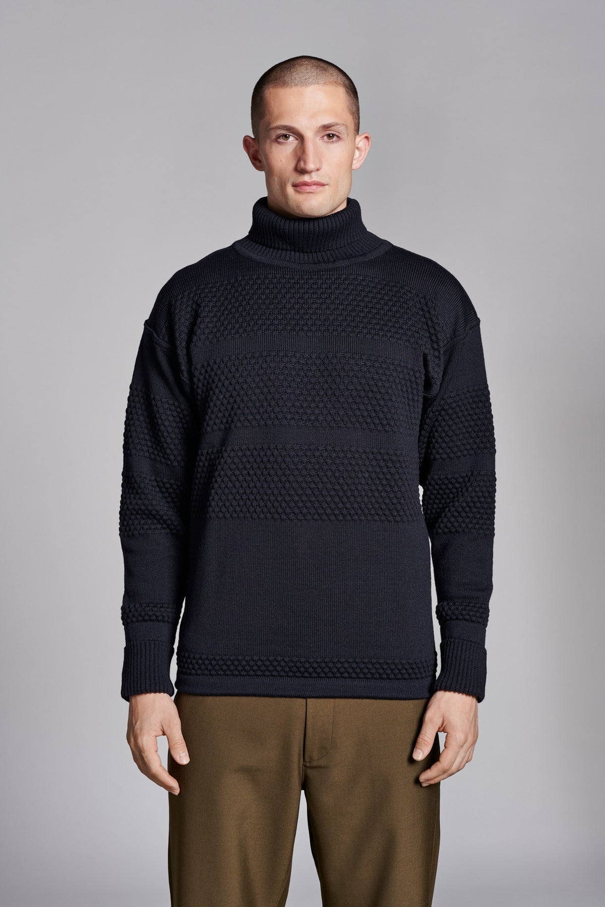 Vi præsenterer vores ikoniske FISHERMAN højhalsede sweater , oprindeligt designet i 1919 og i dag fejret som et symbol på slidstærkt, funktionelt design. Denne kraftige, men raffinerede strik er fremstillet af 100% ny uld og giver overlegen varme og komfort. Med en vægt på 0,92 kg tilbyder dens 7GG rytmisk teksturerede strik og signatur "boble"- (knop) paneler en unik æstetik med tidløs appel.